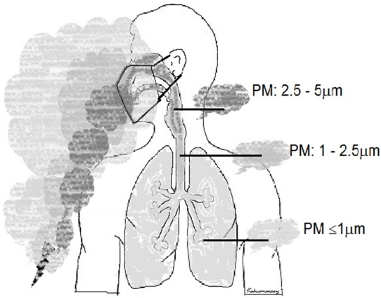 Figure 1: The sizes of the smoke particles passing through the surgical mask and the regions they reach in the respiratory tract (PM=size of particulate matter) (author’s drawing)