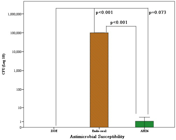 Also, our results showed the average number of C. albicans cfu in exposure to ZOE sealer was 0.01±0.01 CFU/mL, with Endo sealer was 100×103±0.001 CFU/mL and with AH26 sealer was 1.1±1.85 CFU/mL. With other words, the highest antifungal effect was related to ZOE sealer and the lowest antifungal effect was related to Endoseal sealer. Based on the results of one-way analysis of variance, there was a significant difference in the cfu of C. albicans d (P<0.001). This finding is also showed in Figure 2 [Fig. 2]. Based on the results of Tukey’s post hoc test, the average cfu of C. albicans in ZOE sealer was lower than that of Endoseal (P<0.001), but it was no significantly difference observed from AH26 (P=0.073). Also, the average cfu formed in Endoseal was higher than AH26 (P<0.001) (Figure 2 [Fig. 2]).