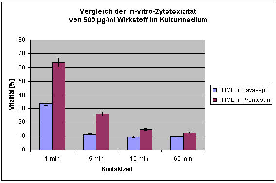 Bei der höchsten Prüfkonzentration von PHMB von 500 µg/l und der kürzesten Einwirkungszeit von 1 min ist der Unterschied der Zytotoxizität zwischen beiden Wundspüllösungen am deutlichsten ausgeprägt. Bei dieser Konzentrations-Zeit-Relation ist die Zytoxizität von Lavasept® etwa doppelt so hoch wie die von Prontosan®. Mit abnehmender Prüfkonzentration und zunehmender Einwirkungszeit schwächt sich dieser Unterschied zunehmend ab.