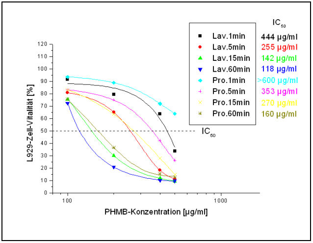 Die IC50-Werte der beiden PHMB-enthaltenden Prüfpräparate betragen nach einer Einwirkzeit von 5 min für Lavasept 255 µg/ml und für Prontosan 353 µg/ml (Abbildung 8 [Abb. 8]).