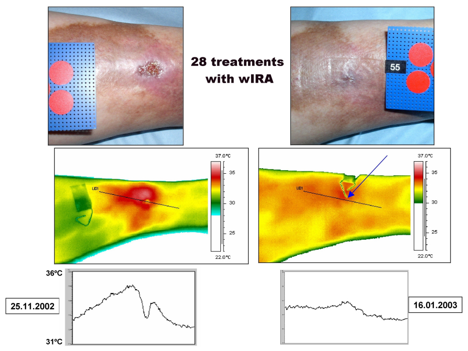 Eine weitere prospektive Studie mit 10 Patienten mit aufwändiger thermographischer Verlaufskontrolle ergab unter Therapie mit wIRA(+VIS) eine vollständige oder fast vollständige Abheilung therapierefraktärer chronischer Unterschenkelulzera bei 7 sowie eine deutliche Ulkusverkleinerung bei 2 weiteren der 10 Patienten, eine ausgeprägte Minderung der Schmerzen und des Schmerzmittelverbrauchs und eine Normalisierung des thermographischen Bildes.