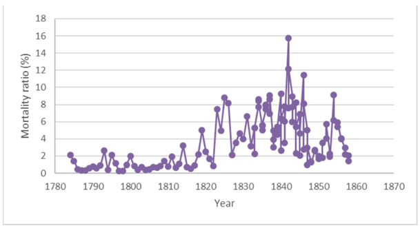 Figure 2: Annual mortality rates at the Vienna hospital from 1784–1858