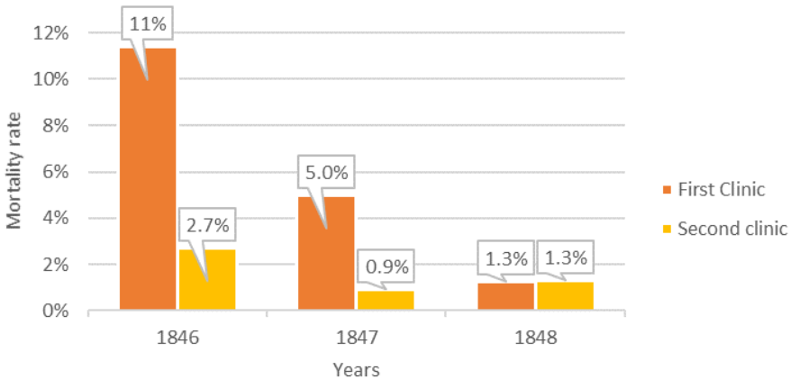 (graph constructed by the authors based on Semmelweis’s statistics as mentioned in his publication [16], [18])
