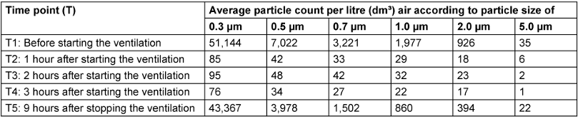 Before starting the ventilation system, the particle count in the operating theatres were quite high, similar to the air outside the OT building. One hour after switching on the ventilation system, a significant air purification in the OT was achieved with a reduction of >98% in the quantity of particles from 0.3 to 2 µm. For particles of 5 µm, a reduction of >82% was achieved after one hour and >97% after three hours.