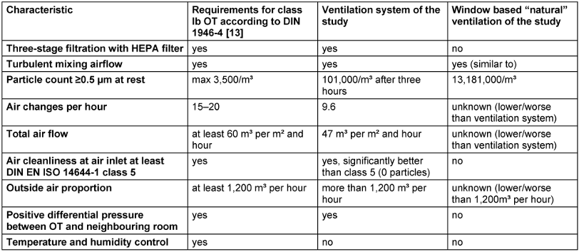 Some important DIN 1946-4 requirements for class Ib operating rooms are met, like air cleanliness DIN EN ISO 14644-1 class 5 at the air inlet, a positive differential pressure from the operating room to the neighbouring room, a three stage filtration and an outside air proportion of >1,200m³/h. Other requirements of DIN 1946-4 are not completely met (Table 2 [Tab. 2]).