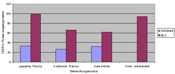 3-D-Epidermismodelle wurden mit gepulstem und ungepulstem Argon-TTP behandelt. Die Messung des TERs erfolgte mit einem EVOMX Epithelial Volt-Ohmmeter und einer STX2 Electrode (World Precision Instruments). Die Behandlung mit TTP führte ebenso wie die Gaskontrolle (gleicher Behandlungsmodus mit Argon-Gas) zu einem Absinken des TERs. Die Inkubation der Epidermismodelle für weitere 42 h resultierte in einem Anstieg der TER (Abbildung 11 [Abb. 11]), was die Reversibilität der Plasmaeffekte auf die Barrierefunktion belegt. Die Anwendung von gepulstem Argon-TTP zeigte gegenüber der unbehandelten Kontrolle sogar einen Anstieg auf 98,6%, was den Wert des Widerstands der Kontrolle (94%) übertraf.
