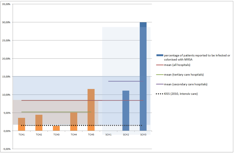 In the four secondary care hospitals the MRSA prevalence was 3.7% and therefore much higher as in the tertiary care hospitals (1.74%), which was unexpected.