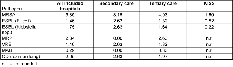 MRSA was the most frequently reported pathogen in all participating hospitals (Table 3 [Tab. 3], Table 4 [Tab. 4], Table 5 [Tab. 5], Table 6 [Tab. 6], Table 7 [Tab. 7], Table 8 [Tab. 8], Table 9 [Tab. 9], Table 10 [Tab. 10], Table 11 [Tab. 11]), followed by CD and ESBL. No patient with CD was reported to require intensive care.