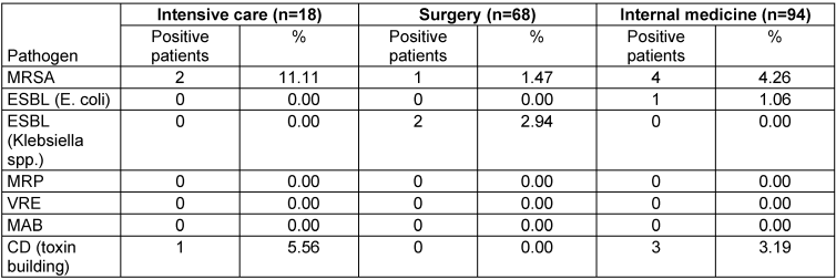 Ergebnisse: Insgesamt wurden 3411 Patienten analysiert. In den Krankenhäusern der Maximalversorgung wurden folgende Prävalenzen ermittelt: MRSA 1,8%, ESBL E. coli 0,45%, ESBL Klebsiella spp. 0,41%, multiresistente Pseudomonaden 0,53%, multiresistente Acinetobacter spp. 0,15%, VRE 0,49% und toxinbildende C. difficile 1,01%. In den Krankenhäusern der Regelversorgung ergaben sich folgende Prävalenzen: MRSA 3,48%, ESBL E. coli 0,4%, ESBL Klebsiella spp. 0,4%, multiresistente Pseudomonas spp. 0%, multiresistente Acinetobacter spp. 0%, VRE 0,13% und toxinbildende C. difficile 1,34%.