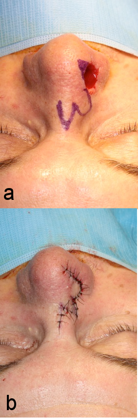 Abbildung 4: a) Angezeichneter bilobed flap mit Ausgleichsdreieck zur Defektdeckung im Bereich des Nasenflügels rechts nach mikroskopisch kontrollierter in sano Resektion eines Basalzellkarzinoms. b) Z.n. Mobilisation des bilobed flaps, Excision des Ausgleichsdreiecks und Fixation im Defekt.