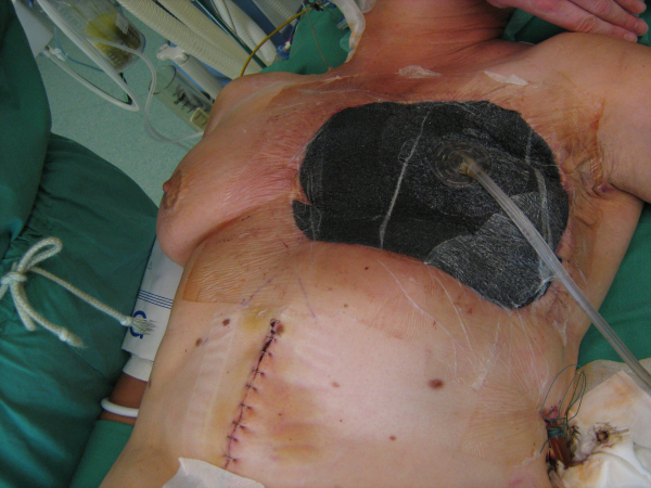 Für das Infektionsmanagement verwenden wir bevorzugt zum Wundverschluss Polyurethanschwämme, welche mit einem Sog von 125 mm Hg an das Sternum gepresst werden (Abbildung 18 [Abb. 18]). Durch diese Vakuumtherapie (VAC®) führen wir zwar eine „offene“ Behandlung durch, aber in einem „geschlossenen“ System. Für den Patienten ist diese Methode von hygienischer Seite wesentlich vorteilhafter, da eine raschere Wundreinigung mir signifikanter Keimreduktion wegen der sofortigen Sekretabsaugung erfolgt, ohne Gefahr einer zusätzlichen Bakterienbesiedlung. Die Wunde ist leichter zu pflegen (weniger Verbands wechsel) und wegen der Geruchsneutralität bedeutet dies für den Betroffenen auch eine gesteigerte Lebensqualität.