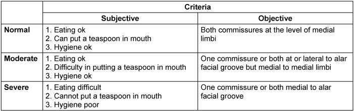 Microstomia was assessed subjectively and objectively as shown in Table 1 [Tab. 1].