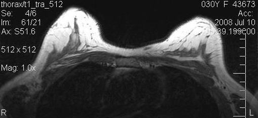 Magnetic resonance imaging (MRI) of the breasts was performed in 5 patients preoperatively and 6 months postoperatively. The evaluation by MRI based volumetry gave inconsistent results, presumably due to the fact that volume (the implant) is first removed, and then added by fat grafting in one procedure. Also, the form of the preoperatively often very tight breasts changed dramatically. All MRI showed massive increase in fat tissue. No cysts were observerd.