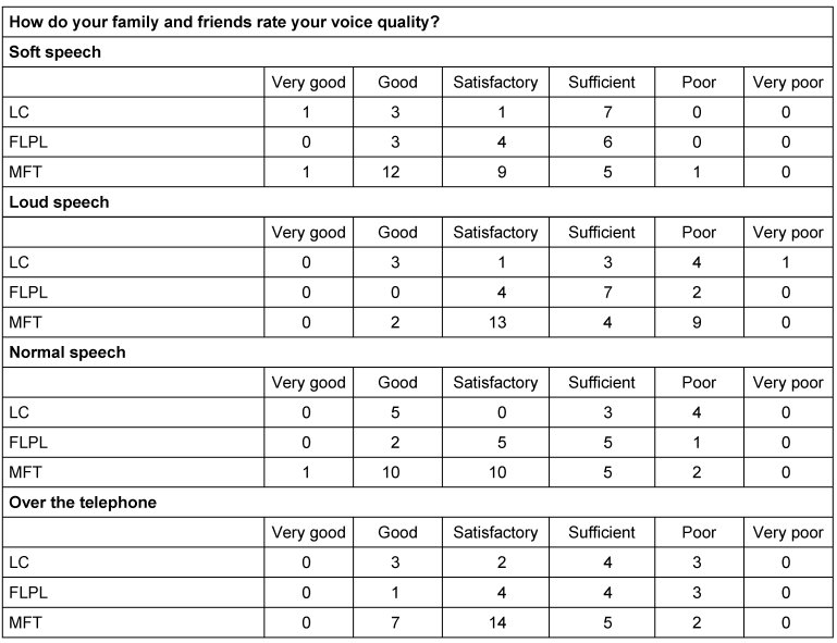 Table 7: Assessment of voice quality by family and friends using a standardised questionnaire (LC = laser cordectomy, FLPL = frontolateral partial laryngectomy, MFT = modified flap technique)
