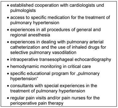 It is important to emphasize that the selection of the anesthesia team is just as crucial as the selection of the anesthetic technique to be used. It is essential to have not only excellent anesthesiological expertise on hand, but also specific knowledge of the pathophysiology of pulmonary hypertension and right-sided heart failure, the interpretation of hemodynamic data, and the corresponding concepts of complex medical treatment.
