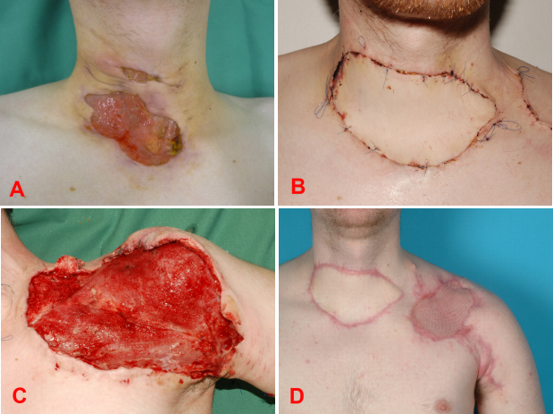 However, following the necessity of increasing the prednisone therapy due to an acute period of colitis ulcerosa, the patient presented himself again 3 weeks after being discharged with multiple dehiscence around the elevation site of the supraclavicular flap with serous outflow. The microbiological tests showed no evidence of bacteria. After multiple debridements, the secondary wound was covered with skin grafts using MatriDerm® as dermal matrix (Figure 2c, d [Fig. 2]). The young, immunocompromised patient could finally be discharged after an overall hospitalization stay of more than 12 weeks.