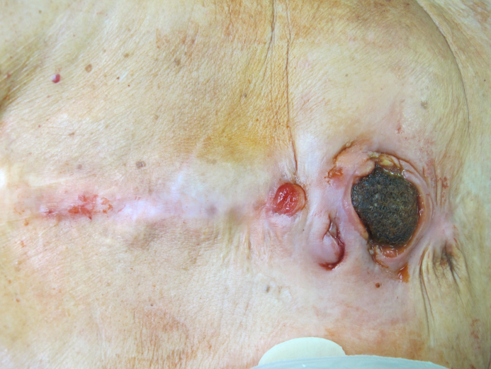 A 90-year-old male patient presented in 5/2018 with a high output small bowel fistula secreting through a 4x4 cm perforation of the skin and through the underlying mesh (Figure 5 [Fig. 5]).