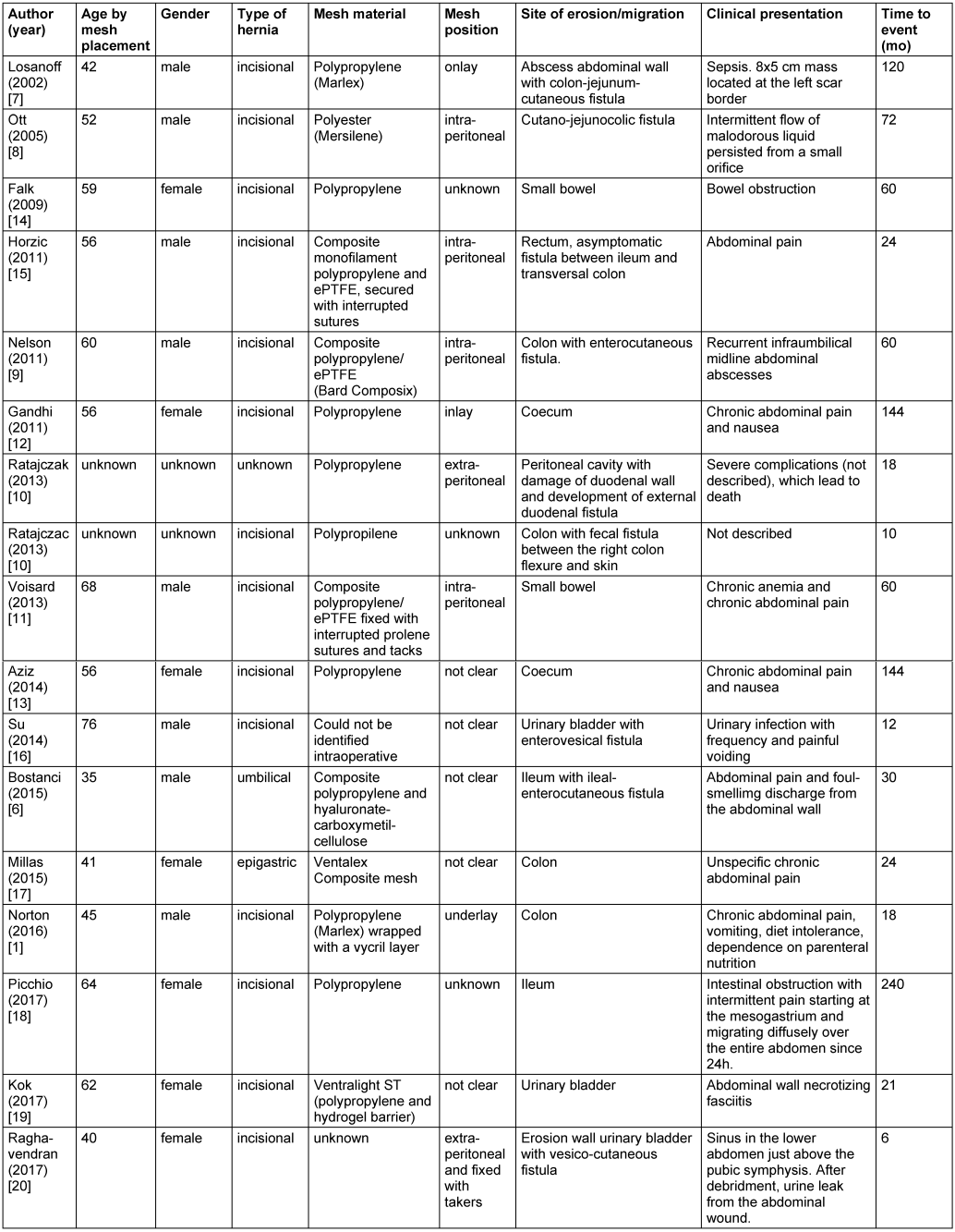 Table 1: Literature on mesh migration/erosion after ventral (n=2) and incisional hernia repair (n=15)