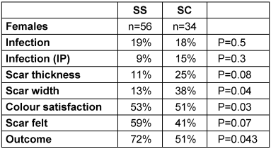 17% of the SS group had unsatisfactory scar thickness as compared to 28% in the SC group (p=0.041), 30% in the SS group noticed a widened scar compared with 45% in the SC group (p=0.019). Only 38% of the SS group could feel the scar as compared with 51% of the SC group (p=0.040). The majority of patients in the SS group (59%) noticed that their scar matched the skin colour, as compared to 45% of the SC group (p=0.042).