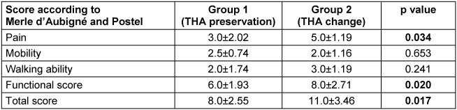 Table 4: Score according to Merle d’Aubigné and Postel in the two groups (pain, mobility, walking ability, functional score, total score)