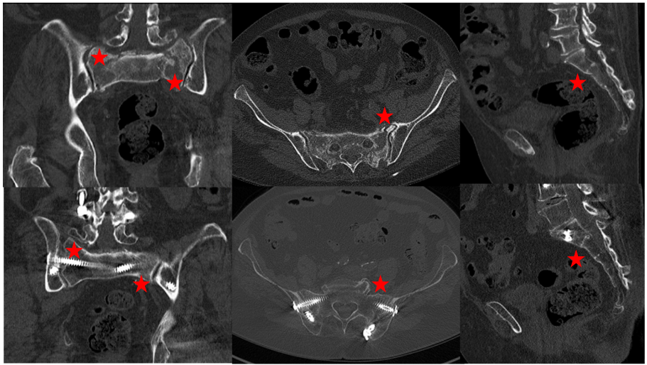 Figure 7: Top row: FFP4b type fracture. The stars mark the fracture zones. Bottom row: bony fusion after triangular stabilization. The stars mark the former fracture zone. No fracture lines visible.