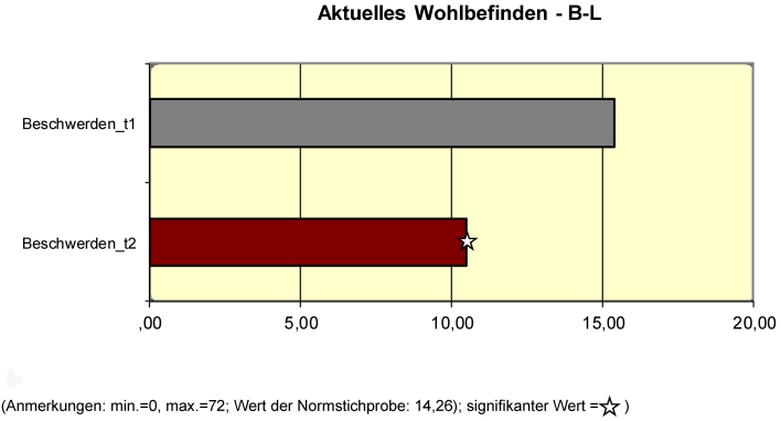 Im Vergleich der Werte der untersuchten Population mit den Werten der Normpopulation in BL-t1, lagen die Werte der Waldorflehrer mit 15.39 Punkten leicht über denen der Normpopulation (gesunde Probanden, Referenzwert: 14.26 Punkte; [22]. Nach den Interventionen in BL-t2 wies die untersuchte Stichprobe signifikant positivere Werte (10.50) als die Normwerte auf. Betrachtet man die Veränderung individueller Werte, zeigten zwei Lehrer in BL-t1 „fraglich abnorme“ Werte, 4 Klienten „sicher abnorme“ Werte, ein Anzeichen für eine akute Beeinträchtigung [22]. Zwölf Lehrer wiesen normale Werte auf. In BL-t2 zeigten 16 Waldorflehrer normale Werte, nur ein Lehrer hatte noch „sicher abnormale“ Werte (in BL-t1: 4 Lehrer) und ein Lehrer „fraglich abnormale“ Werte. 88% der Lehrer verfügten am Ende des Gesundheitstags über normale Werte. Insgesamt gesehen zeigte sich eine signifikante Reduktion der Beschwerden, so dass von einer Steigerung des aktuellen physischen Wohlbefindens ausgegangen werden kann. Bezogen auf die Veränderung einzelner Beschwerden ergab der Wilcoxon-Vorzeichen-Rangtest bei 9 von 24 Items signifikante Veränderungen, und zwar bei „Kloßgefühl, Engigkeit oder Würgen im Hals“, „Kurzatmigkeit“, „Schluckbeschwerden“, „Reizbarkeit“, „Grübelei“, „Kreuz- oder Rückenschmerzen“, „Innere Unruhe“, „Unruhe in den Beinen“ sowie „Nacken- oder Schulterschmerzen“. Bei einem Item („Übermäßige Schlafbedürfnis“) zeigte sich in BL-t2 eine Verschlechterung der Werte [19].