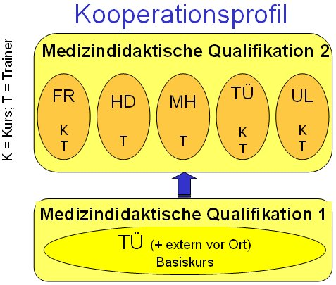 Das Kooperationsprofil (siehe Abbildung 1 [Abb. 1]) zeigt das Prinzip der Zusammenarbeit der medizinischen Fakultäten. Das Basis-Curriculum wird hauptsächlich in Tübingen mit Unterstützung externer Ausbilder/innen durchgeführt, aber auch extern vor Ort angeboten. Im Aufbau-Curriculum beteiligen sich je nach Ressourcen alle medizinischen Fakultäten, sei es über ein besonderes Kursangebot, das sie landesweit anbieten wie Freiburg, Ulm und Tübingen, und/oder zumindest über den Einsatz von Trainern und Trainerinnen.