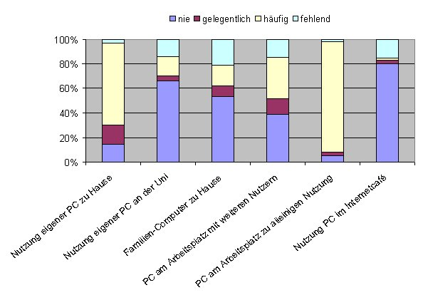 Am häufigsten nutzen die Befragten den eigenen PC am Arbeitsplatz, gefolgt vom eigenen PC zu Hause. Es schließt sich die Nutzung gemeinsamer PCs am Arbeitsplatz an. Am seltensten werden Notebooks (via W-Lan) an der Uni und kommerzielle PCs in Internetcafes genutzt.