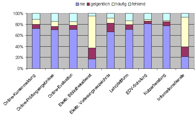 Bei der Nutzung liegen ebenfalls die elektronischen Bibliotheksdienste an erster Stelle, danach folgen Informationsdienste. Gelegentlich wird auch das elektronische Vorlesungsverzeichnis genutzt. Weitere Dienste werden von bis zu 80% der Befragten nicht genutzt.
