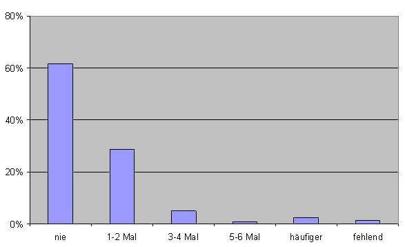 Die Verteilung der Nutzung in Universität und Klinik gestaltet sich äußerst konträr. Findet man bei der Nutzung des Internets in der Universität die ersten drei Quartale im Bereich 1-19 Stunden, so sind es bei der Nutzung im klinischen Bereich gerade mal die ersten 25%, die zwischen 1 und 19 Stunden von einem PC in der Klinik surfen. Der Großteil der Studenten nutzt keinen klinischen Computerzugang (54,6%). Etwa ein Sechstel (15,8%) nutzen das Internet nicht an der Universität. Diese Frage weist eine hohe Anzahl fehlender Werte auf.