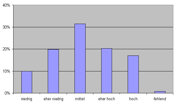 Die prozentuale Verteilung zeigt, dass über die Hälfte aller Befragten ihre Kenntnisse als "umfangreich" und immer noch fast ein Drittel als "mittel" einstufen. Ein kleiner Prozentsatz (6,8%) empfindet die eigenen Kenntnisse als "gering". Diese Frage wurde von 2,79% der Probanden nicht beantwortet.