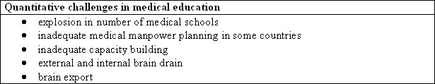 One paramount problem worldwide is the rapid increase in the number of new medical schools, which have serious consequences for the quality. Over the last ten years, we have seen an increase of medical schools of about 100 per year. Many have been established on foundations of insufficient resources, many are lacking sufficient clinical settings and many do not have a research attainment. A new trend has been the rise of commercialised medical schools in the form of "for profit" medical schools, the main goal of which is the easy and convenient production of graduates. Such schools particularly attract students who are academically unqualified to enter well-established schools, but who are affluent.