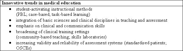 In the first decade of the twenty-first century, a number of innovative trends in medical education can be found around the world (table 18 [Tab. 18]).