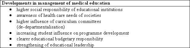 Die Medizinische Ausbildung zeigt Entwicklungen, die auch in anderen Feldern der universitären Ausbildung vorherrschen. Im Rahmen der Internationalisierung und Globalisierung in Verbindung mit Innovationen der Informations- und Kommunikationstechnologien sowie der ausgeprägten Migration von Ärzten wurden Folgen wie Kommerzialisierung und Privatisierung beobachtet. Dies wiederum hat eine Qualitätssicherungsbewegung hervorgebracht, die eine Standardisierung und Akkreditierung in den Mittelpunkt stellte.