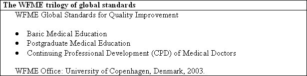 A new WFME project related to accreditation offers a package for assistance in establishing accreditation, comprising national specifications of standards, assistance in institutional self-evaluation, external review, site visits and recommendations regarding procedure information can be found on http://www.wfme.org.