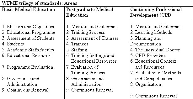 Die Entwicklung von Standards in der medizinischen Ausbildung Europas begann mit der EU Richtlinie Medizin, die sich im Kern seit 30 Jahren nicht geändert hat. Die wachsende Internationalisierung der medizinischen Ausbildung, die eine Reihe von innovativen Ansätzen hat, die aber auch viele Probleme und Herausforderungen bietet, unterstreicht die Bedeutung des WFME-Programms für Globale Standards, das im Jahr 1997 begonnen wurde. Die Trilogie der Globalen Standards deckt das Kontinuum der medizinischen Ausbildung ab und wurde überall in der Welt übernommen. Die Standards für die grundständige Medizinische Ausbildung werden in Reformprogrammen vieler Medizinischer Fakultäten verwendet und bei der Definition nationaler Akkreditierungsstandards eingesetzt.