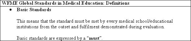In the early stages of developing of the Trilogy, it became clear that specifying global standards in any restricted sense would exert insufficient impact, and indeed would have the potential to lower the quality of medical education. Thus, a lever for change and reform had essentially to be incorporated. This led to the concept of the WFME standards to be framed to specify attainment at two different levels: (a) basic standards or minimum requirements; and (b) standards for quality development.