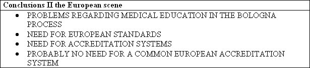 There are groups working for an European accreditation system trying to transfer the LCME system in North America to Europe without recognising the traditional differences in medical education and in the attitudes to recognition or accreditation within Europe. At the moment it is not realistic to work for such a common accreditation system for reasons mentioned in table 35 [Tab. 35].