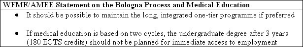 In February 2005, the World Federation for Medical Education (WFME) and the Association for Medical Education in Europe (AMEE), in co-operation with the Association of Medical Schools in Europe (AMSE) and the World Health Organization (WHO) Office for the European Region, published a statement on the Bologna Process and medical education.