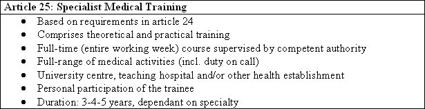 The overall objective of the new EU Directive on recognition of professional qualifications (table 5-9 [Tab. 5] [Tab. 6] [Tab. 7] [Tab. 8] [Tab. 9]), which for medicine is a continuation of the previous medical directive 93/16/EC, is the mutual recognition and free movement of medical doctors. Essentially, the requirements of the EU Directive have not been changed since the first medical directives of 1975.