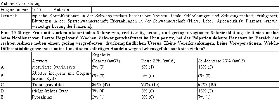 Die Autoren erhalten als Rückmeldung über das Antwortverhalten der Studierenden auf ihre Fragen eine fragenbezogene Auswertung, wie in der Abbildung 2 [Abb. 2] dargestellt. Sie zeigt, wie häufig jede Antwortalternative von den Studierenden gewählt wurde. Um zu sehen, ob eine Frage gut zwischen den leistungsstarken und den leistungsschwächeren Studierenden unterscheidet, enthält die Autorenrückmeldung auch das Antwortverhalten der 25% Testbesten und 25% Testschlechtesten. Die Rückmeldung an die Autoren ist ein wichtiges Instrument zur Curriculumsevaluation und -optimierung. Da fast alle Fragenautoren auch Dozenten im RSM sind, können sie der Autorenrückmeldung entnehmen, wie "erfolgreich" ihre Lehrveranstaltung war. Durch die Rückkopplung der Prüfungsergebnisse an die Blockplanung, können die Lernziele immer wieder auf Sinnhaftigkeit und Realisierbarkeit überprüft werden.