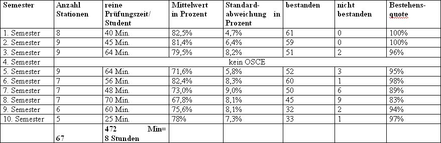 Tabelle 2 [Tab. 2] zeigt, dass die Studierenden im Verlauf ihres Studiums ca. 8 Stunden Prüfungszeit durchlaufen. Diese Vielzahl an OSCE's kann nur mit Hilfe des Simulationspatientenprogramms und den räumlichen Gegebenheiten des "Trainingszentrums für ärztliche Fertigkeiten" (TÄF) realisiert werden. In allen Anamnese-, Aufklärungs-/Beratungsstationen und den meisten Untersuchungsstationen werden Simulationspatienten bzw. Modelle eingesetzt. Die Durchführung ist auch mit einem hohen personellen Aufwand für die Fakultät verbunden, da alle Stationen mit Prüfern besetzt werden. Im Wintersemester 2003/04 waren 78 Fakultätsmitglieder als Prüfer tätig. Ein positiver Effekt dieser Aktivitäten bei den Prüfern ist die Reflektion über Anspruch und Wirklichkeit im Hinblick auf die praktischen klinischen Fertigkeiten. Aufgrund der OSCE Ergebnisse wurden bereits Unterrichtskonzepte für die praktische Übungen überarbeitet und ein "Leitfaden zu klinischen Untersuchungen und praktischen Fertigkeiten" [17] veröffentlicht.