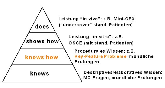 Welche Prüfungen nun welche Fähigkeiten bzw. Fertigkeiten überprüfen, veranschaulicht die modifizierte Pyramide von Miller [11] (siehe Abbildung 1 [Abb. 1]).