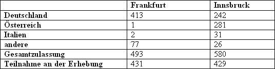 An der Medizinischen Universität Innsbruck wurde für das WS 2005/2006 die Studierendenzahl der Human- und Zahnmedizin erstmals auf 550 begrenzt. Dies wurde durch die hohen Bewerberzahlen vor allem aus Deutschland durch eine Gesetzesänderung vom 8.7.2005 erforderlich. Die Aufnahme wurde durch eine Stichtagsregelung kontrolliert; die ersten 550 Bewerber, die eine komplette Bewerbung abgegeben hatten, wurden aufgenommen. Ausschlusskriterium waren Uhrzeit und Datum des Poststempels. Die Teilnehmer von der Medizinischen Universität Innsbruck stellen damit eine Kohorte dar, bei denen Schulnoten oder andere Leistungen nicht als Zulassungskriterium berücksichtigt wurden. Im Gegensatz dazu stellen die Studienanfänger der JWG-Universität Frankfurt eine nach Noten zugelassene Kohorte dar; Bewerber mit schwächeren schulischen Leistungen sind in dieser Kohorte nur in sehr geringem Umfang vertreten (Wartezeitstudierende). In der Tabelle 1 [Tab. 1] ist die Anzahl der Studienanfänger an den Universitäten nach Herkunftsland aufgeschlüsselt.