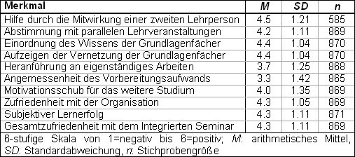 Tabelle 3: Merkmale und Bewertungen der Abschlussevaluation über die ersten drei Semester hinweg