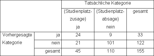 • Wie verhalten sich die tatsächlichen Kategorien „Zusage – ja“ versus „Zusagen – nein“ zu den mittels der Analyse vorhergesagten Kategorien? Welcher positiv prädiktive Wert des Verfahrens ergibt sich?