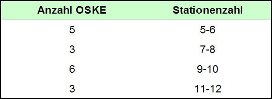 An 19 von 24 TZ wurden OSKE (objektive strukturierte klinische Examina) durchgeführt. 11 TZ führten einen OSKE pro Semester durch, maximal wurden 6 OSKE pro Studienjahr angegeben. Pro OSKE wurden zwischen 42 und 720 Studenten (Median: 160 Studenten) geprüft. Im Rahmen einiger Modell-/Reformstudiengänge fungierten OSKE auch als Physikumsersatz. 11 TZ setzten die OSKE als summatives Prüfungsinstrument ein, 2 Fakultäten als formatives und 4 weitere prüften sowohl summativ als auch formativ durch OSKE. Die OSKE bestanden aus 5 bis 12 Stationen (siehe Tabelle 5 [Tab. 5]), wobei die meisten OSKE interdisziplinär gestaltet waren, lediglich in 2 OSKE wurden nur Fertigkeiten der Allgemein- bzw. Inneren Medizin geprüft. Eine teststatistische Auswertung erfolgte in 15 TZ.