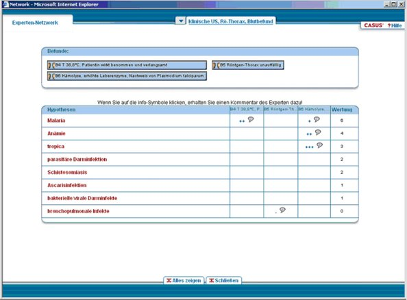 Das tabellarisch aufgebaute Netzwerk-Tool in CASUS öffnet sich als ein zusätzliches Bildschirmfenster, in dem der Lernende nochmals alle in diesem Kapitel erhobenen Befunde vor sich sieht. Der Studierende hat nun die Möglichkeit, über ein Eingabefeld in der Bedienleiste des Programms geeignete Differentialdiagnosen einzugeben. Nachdem der Benutzer seine Hypothesen eingeben hat, kann er Verknüpfungen zu den Befunden mit Hilfe von kurzen Pop-Up-Listen erstellen und mit der Auswahl von „+++“ für „der Befund spricht stark für die Hypothese“, bis „- - -“ für „der Befund spricht stark gegen die Hypothese“ in sechs Stufen gewichten. Am Ende dieses Prozesses hat der Lernende die Möglichkeit, die selbst festgelegte Wertigkeit seiner Hypothesen im Bezug auf die Befunde durch automatisches Aufaddieren der Verknüpfungen zwischen einer Hypothese und den Befunden zu überprüfen. Die Hypothese, der in der Summe die meisten positiven Werte zugeordnet wurden, erscheint im Netzwerk-Tool an oberster Stelle. Im Anschluss daran kann der Lernende das selbst erstellte Netzwerk mit einem vom Fallautor erstellten Netzwerk vergleichen. Er erhält so ein Feedback zur selbst erbrachten Leistung. Diese Experten-Lösungen werden in den CASUS Lernfällen von Spezialisten der entsprechenden Fachrichtungen bereitgestellt und sind auf das entsprechende Curriculum abgestimmt