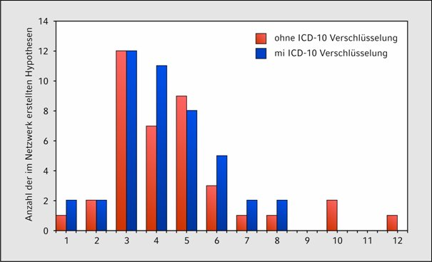 Insgesamt wurden im Rahmen der Studie 87 Netzwerke untersucht. Davon wurden 48 (Gruppe A) unter Zuhilfenahme des Kodierungsschlüssel ICD-10 erstellt, 39 Netzwerke (Gruppe B) entstanden ohne vorherige Verschlüsselung. In der Gruppe A mit ICD-10 Verschlüsselungen wurden durchschnittlich drei Hypothesen pro Fall erzeugt in der Gruppe B ohne Verschlüsselung durchschnittlich vier Hypothesen, wobei in beiden Gruppen, mit 14 Netzwerken in Gruppe A und 12 Netzwerken in Gruppe B, am häufigsten drei Hypothesen pro Fall erstellt wurden (siehe Abbildung 3 [Abb. 3]).