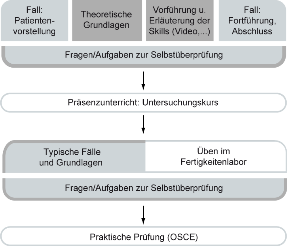 Die beiden computergestützten Lerneinheiten werden im Begriff „Modul“ zusammengefasst. Die Lerneinheit zur Vorbereitung beginnt mit dem Einstieg in einen Patientenfall, mit dem ein Problembewusstsein geschaffen und Vorwissen aktiviert wird. Es folgt die systematische Wissensvermittlung zum Thema, in der insbesondere die für die Untersuchungstechniken relevanten anatomischen und physiologischen Grundlagen dargestellt und die Untersuchungstechniken selber in Video, Grafik, Foto, Animation und Text vorgestellt werden. Anschließend wird der Einstiegsfall wieder aufgegriffen, weiter geführt und abgeschlossen. Nach der Präsenzveranstaltung, in der die Studierenden die bereits im Film gezeigte standardisierte Untersuchung unter Aufsicht einüben, wird eine weitere computergestützte Lerneinheit des Moduls zur Nachbereitung bearbeitet. Diese besteht aus verschiedenen Fällen, in denen die Studierenden ihr erworbenes Wissen transferieren. Fragen zur Selbstüberprüfung sind im gesamten computergestützten Lernmodul integriert, um die Aktivität und Motivation der Studierenden zu fördern und der Entstehung von Kompetenzillusion vorzubeugen: Die Studierenden erhalten Rückmeldung über ihren Wissensstand, den sie optional mit dem ihrer Peers in Beziehung setzen können (Klassenspiegel). Haben sie eine Frage falsch beantwortet, wird ihnen nahe gelegt, die jeweiligen Inhalte noch einmal nachzulesen, auf die sie per Link einfach zugreifen können. Alle Inhalte stehen jederzeit zur Verfügung, sodass die Studierenden so lange bzw. häufig mit ihnen arbeiten können wie es für ihre individuelle Vorbereitung auf Praktikum, Prüfung und Unterricht am Krankenbett erforderlich ist.